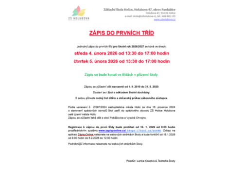 Zveme Vás k zápisu do naší školy, který proběhne ve dnech 4. a 5. února 2026. K zápisu se prosím registrujte na
