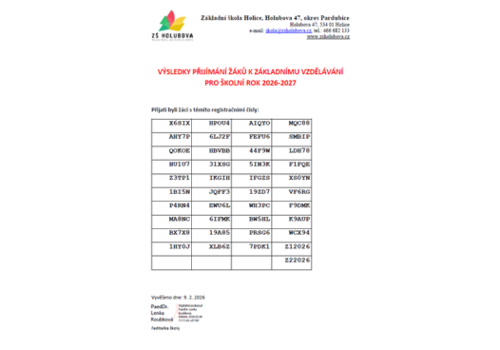 Výsledky Zápisu do 1. tříd 2026